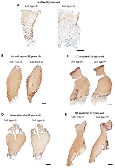 Immunohistochemistry of collagen types III and VI. Monoclonal and polyclonal antibodies were used to detect the presence of collagens type III and VI, respectively, in cryosections of core biopsies. For the repair tissues, two donor-matched samples of natural and cell therapy (CT) repaired cartilage are shown as representative examples (B + C = donor 7, D + E = donor 9). (A) Healthy cartilage showing interterritorial staining for collagen type III and pericellular staining for type VI (donor 15). (B,C) In this instance of hyaline-like cartilage in naturally repaired cartilage, the collagen type III was localised in the interterritorial region while collagen type VI was localised in the pericellular matrix. (D,E) Both collagens type III and VI are diffused in the matrix of fibrocartilage. Scale bar = 500 µm. Isotype controls found in Figure S1D,E.