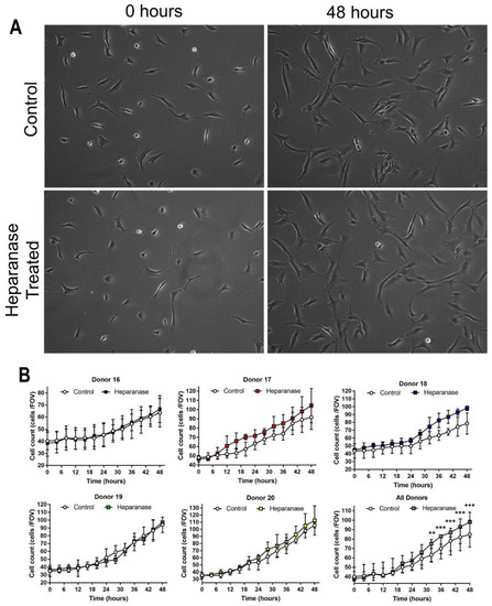 No discernible difference in morphology was observed in chondrocytes cultured in monolayer which had been treated with 200 ng/mL of heparanase compared to untreated controls after 48 h (Figure 5A). Separate and combined growth plots are shown for the individual donor cell populations tested in Figure 5B. Whilst there is variation between donors, a combined assessment of the cell populations showed that, for the first 20 h, the heparanase-treated and control chondrocytes showed similar growth rates, but diverged from 24 h onwards with treated cells showing significantly higher proliferation rates than untreated control cells between 32 and 48 h (Figure 5B, bottom right plot).