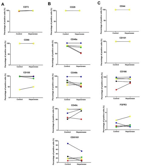 Flow cytometry analysis of the effects of heparanase treatment on surface markers of chondrocytes (n = 5). Results are shown as the percentage of positive cells for a particular marker on heparanase-treated chondrocytes and the matching control. Fluorochrome-conjugated antibodies were used to detect (A) stem cells markers, (B) integrins and (C) chondrogenic markers. No significant differences were observed. Matched samples are represented by the same colour dot; donor 16 (black), donor 17 (red), donor 18 (blue), donor 19 (green), and donor 20 (yellow).