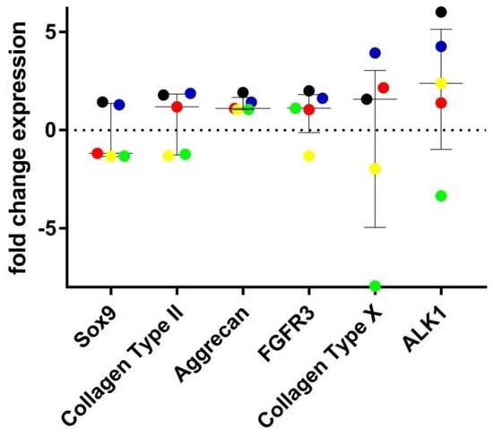 Analysis of the effects of heparanase treatment on gene expression of chondrocytes in monolayer culture (n = 5). Results are presented as log-fold change in the expression of the chondrogenic genes SOX9, collagen type II, aggrecan, FGFR3 and hypertrophy genes collagen type X and ALK1 in chondrocytes that were treated with heparanase compared to the untreated controls. Matched samples are represented by the same colour dot; donor 16 (black), donor 17 (red), donor 18 (blue), donor 19 (green), and donor 20 (yellow). Error bars indicate medians and interquartile ranges.
