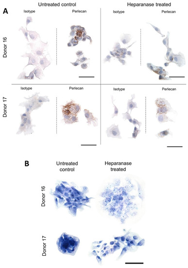 Immunocytochemistry and toluidine blue staining of heparanase-treated chondrocytes (two representative donor examples shown). (A) Chondrocytes cultured in chamber slides were treated with heparanase for 48 h and stained for perlecan (n = 4). Chondrocytes in untreated controls tended to remain in clusters that stained more intensely for perlecan compared to heparinase-treated chondrocytes. (B) Toluidine blue staining revealed no noticeable trend. However, cell clusters in both controls and heparanase conditions had stronger staining than individual cells. Scale bars = 50 µm.