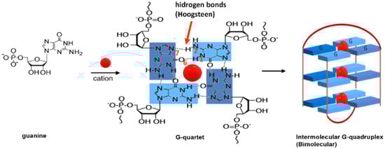 The presence of repetitive sequences of the nucleobases thymine (T), adenine (A) and guanine (G), in the sequence TTAGGG (abbreviated as T2AG3), and of secondary structures, such as the G-quadruplexes (GQ) at the end of telomeres (whose function is to protect telomere ends from nuclease attack) enables indirect targeting of telomerase [9,10,11]. GQ are higher-order DNA structures formed by the self-assembly of four guanine (G) bases in a planar quadrangular arrangement via Hoogsteen hydrogen bonding, known as G-quartets (Figure 2). The subsequent stacking of these quartets on top of each other via π-π interactions can give rise to different GQ conformations, as is exemplified in Figure 2 for an intermolecular (bimolecular) GQ conformation [12].