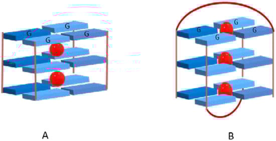Cation positions between stacked quartets (A) or within the plane (B) in a G-quadruplex containing three quartets (for simplicity, backbones were omitted).