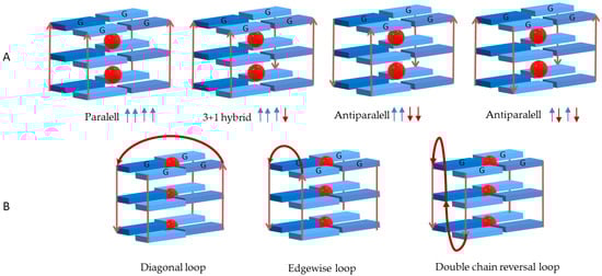 (A) Different conformations assumed by G-quadruplexes structures depending on strand orientation and (B) possible loop geometries.