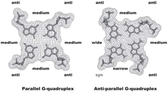 Changes in strand direction also affect the guanine glycosidic torsion angles and will further alter the relative position of the sugar ribose and the groove dimension. In the case of parallel GQ, all the guanine glycosidic torsion angles are characteristic of an equivalent anti conformation, thus the four grooves’ dimensions are all equivalent. If one of the strand orientations changes to an antiparallel arrangement, changes in guanine glycosidic torsion angles occur and adopt both syn and anti conformations. These changes will further alter the groove dimensions, generating narrow, medium and wide grooves (Figure 5).