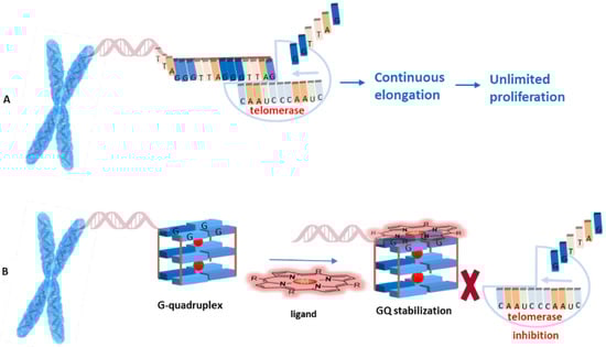 It has been found that G-quadruplexes are recognized and partially unwound by telomerase for 3′-end extension, thus the binding of stabilizing compounds to G-quadruplex structures will “lock” the telomeres in the G-quadruplex configuration, preventing telomere lengthening by telomerase (Figure 6) [23].