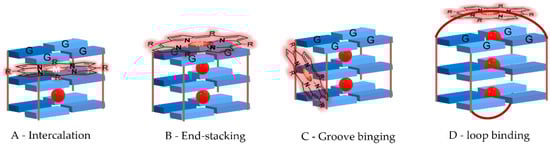 Different GQ recognition modes are possible: intercalation (Figure 7A), outside stacking on the ends of the G-quartet core, also known as end-stacking (Figure 7B), and interaction with the backbone (core and loop bases) known as groove or loop binding (Figure 7C,D). Since the GQ structure is rigid and stable, the distortion triggered by the intercalation of a ligand has an energetic cost. In this way, outside stacking (Figure 7B–D) is seen as the more favorable binding mode [39].