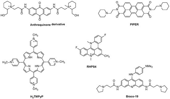 Under the context of aromatic ligands containing fused rings, the dicationic anthraquinone derivative presented in Figure 8 was the first ligand reported to inhibit telomerase function [38]. Many other small ligands were then reported to inhibit telomerase activity with small half-maximal inhibitory concentration (IC50) values, like tri-substituted acridines (e.g., BRACO-19) [49], the perylene tetracarboxylic diimide derivative (PIPER) [50], the fluorinated polycyclic quinoacridinium cation (RHPS4) (Figure 8) and dibenzophenanthroline derivatives [51], among others [12,39,52].
