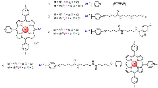 The type of interaction between cationic porphyrins and DNA structures depends not only on the location, size and charge of peripheral substituents but also on the presence or absence of metal in the porphyrin core [14]. It has been reported that the presence, at meso positions, of pyridinium substituents not only favors interactions with DNA by π-π stacking but also improves its water solubility, thus being an important feature for telomerase inhibition [31,39,63,64].