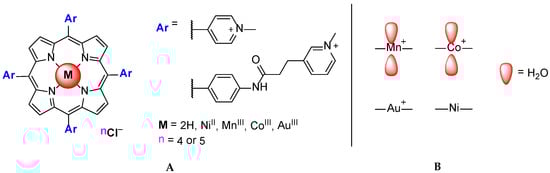 Structure of H2TMPyP and analogs with bulky substituents (A); presence or absence of axial substituents in different metal ions (B) studied by Romera et al. [60].