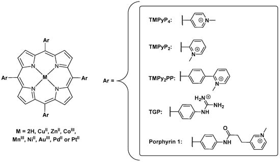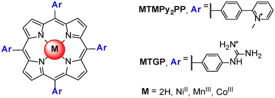 Structures of 5,10,15,20-tetrakis(4-(N-methyl-pyridinium-2-yl)phenyl)-porphyrin (MTMPy2PP) and 5,10,15,20-tetrakis(4-guanidinophenyl)porphyrin (TGP) derivatives, studied by Sabater et al. [73].