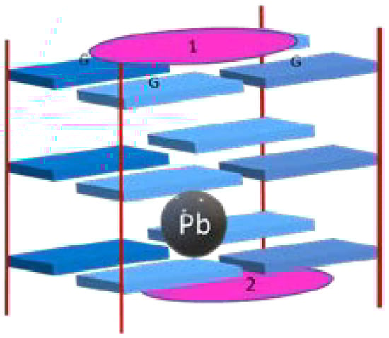 ZnIITMPyP was also explored in an interesting work where its interaction with a quadruplex structure stabilized by the unusual presence of lead ion (Pb-GQ) (Figure 13) was evaluated using CD and UV-Vis spectroscopy and mass spectrometry [75]. The Pb-GQ structure was found to be formed in a 1:1 stoichiometry (PbII-GQ). The ZnIITMPyP was described as a Pb-GQ structure-stabilizing ligand. The steric hindrance of the axial ligand of ZnII and the relatively rigid structure of Pb-GQ was pointed out as factors that precluded the ligand intercalation and an interaction exclusively by end-stacking was proposed.
