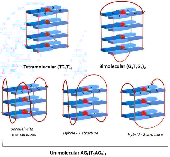 Depending on the number of DNA strands involved in the GQ arrangement, conformations mediated by intra- or intermolecular interactions are formed. Structures formed from one, two or four separate strands of DNA give rise, respectively, to GQ in uni-, bi- or tetramolecular conformations [13,14]. The GQ structures are also dependent on the spatial orientation of the strands and are designated as parallel, antiparallel or hybrid depending on the relative strand orientation (Figure 4A). The formation and stability of all unimolecular (intramolecular) and bimolecular (intermolecular) GQ structures imply the presence of three or four loops with different sizes and sequences. The single-strand sections that are not involved in the G-quartet arrangement form loops that link the guanines bases. These loops can adopt different geometries, namely edgewise (or lateral), double-chain-reversal (or propeller) and diagonal (Figure 4B). The loop residues can further stabilize GQ structures through hydrogen bonds and by stacking interactions.