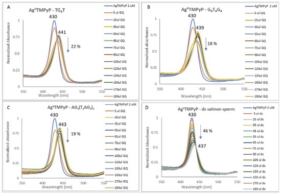 The interaction of the ZnIITMPyP with three different GQ structures, (TG4T4)4, (G4T4G4)2 and AG3(T2AG3)3 with tetramolecular, bimolecular and unimolecular topologies, respectively, was also evaluated using transient absorption spectroscopy to monitor the triplet decay dynamics of ZnIITMPyP [78]. The coexistence of different binding modes via π-π stacking of porphyrin macrocycle and the G-quartets was quantitatively identified and described as being intercalation/end-stacking for (G4T4G4)2 and AG3(T2AG3)3 and end-stacking/partial intercalation for (TG4T4)4. The authors reinforced that the intercalation process is undesirably affected by the steric hindrance of the axial water. Binding stoichiometric ratios of 1:2 for (TG4T4)4 and AG3(T2AG3)3, and of 1:1 for (G4T4G4)2, were reported for GQ/ZnIITMPyP adducts.