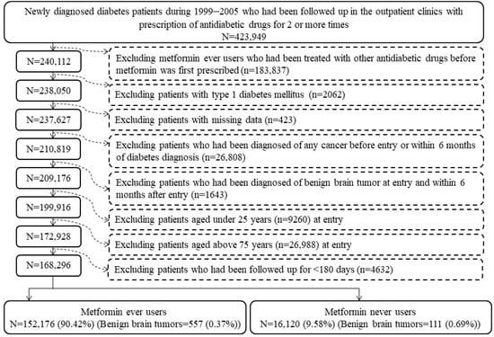 The step-by-step procedures in Figure 1 were used to create a cohort of patients with T2DM enrolled in the study. First, we identified 423,949 patients who were newly diagnosed with diabetes mellitus between 1999 and 2005 and had received two or more times a prescription of antidiabetic drugs in the outpatient clinics. Ever users of metformin were defined as patients who had received metformin as the first antidiabetic drug. Therefore, 183,837 patients who had received a prescription of any other antidiabetic drug before metformin was initiated were first excluded. Ineligible patients who fitted the following criteria were then excluded: (1) 2062 patients who had been diagnosed as having type 1 diabetes mellitus, (2) 423 patients who had missing data, (3) 26,808 patients who had been diagnosed with any cancer before the entry date or within a short period of six months after diabetes diagnosis, (4) 1643 patients who had a previous diagnosis of BBT before enrollment or within 6 months of diabetes diagnosis, (5) 9260 patients aged <25 years, (6) 26,988 patients aged >75 years and (7) 4632 patients who were followed up for a duration of <180 days. As a result, we identified 152,176 ever users and 16,120 never users of metformin for the study.