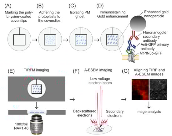 Workflow of TIRFM/A-ESEM CLEM of NtPIN3b auxin efflux carriers in the PM of tobacco cell protoplast ghosts. (A–C) Poly-L-lysine coated coverslips are labeled with adhesive tape, protoplasts are adhered on coverslips and PM ghosts are isolated by several quick flicks. (D) Indirect immunofluorescence staining of NtPIN3b-GFP. Protein, antibodies and gold after enhancement are shown in real size ratios. (E) TIRF microscopy on wet samples using a custom aluminum stage insert and a high numerical aperture objective. (F) A-ESEM performed on dried samples. (G) Software-assisted alignment of TIRFM and A-ESEM images using fiducials defined by superimposing bright field and A-ESEM overview images.