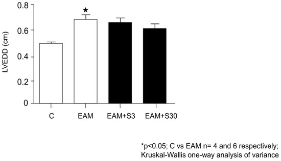 Echocardiographic results showed a significant (0.53 ± 0.02 vs. 0.64 ± 0.11, n = 5, p < 0.05) increase in LVEDD in EAM rats in comparison with the C group (Figure 1). Both groups of simvastatin treated rats showed no significant difference with the C group (Figure 1).
