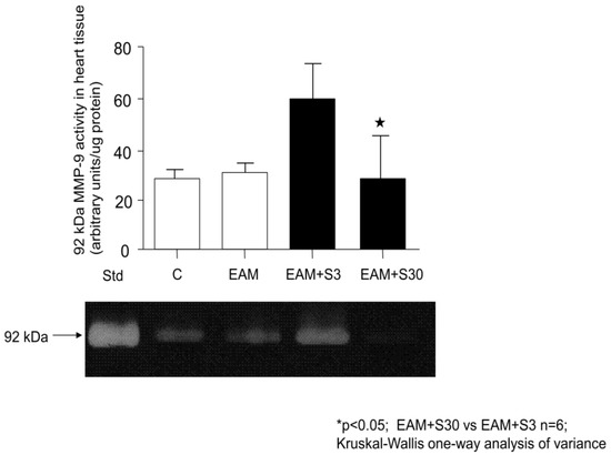 As a result of EAM, there was an enhanced activation of MMP-9 especially in EAM+S3 group, which was abolished by high dose of simvastatin—it was a significant reduction of MMP-9 activity in the EAM+S30 group in comparison with the EAM+S3 group (58.37 ± 33.63 AU/μg vs. 10.30 ± 8.72 AU/μg, n = 5 p < 0.05) (Figure 2).