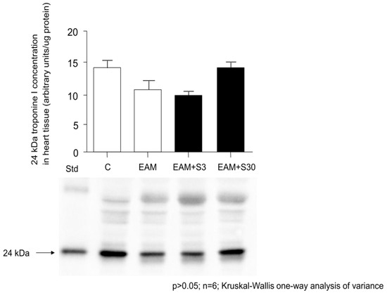 Western blot showed no significant differences in troponin levels between groups, however, the mean troponin level was the highest in the EAM+S30 group (13.75 ± 2.44 ng/μL vs. 13.72 ± 2.33, 10.36 ± 4.11, 9.85 ± 1.09 ng/μL in C, EAM, and EAM+S3 groups respectively (Figure 3).