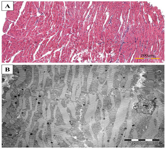 The representative images of cardiac muscle from not immunized rats without simvastatin (group C). The healthy heart without mononuclear cell infiltrates ((A), HE stain) and a typical ultrastructure of heart with proper cross striations and abundant mitochondria ((B), TEM).