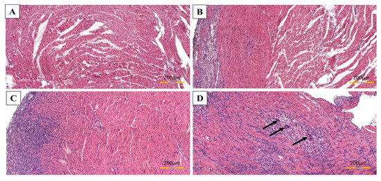 The acuteness of inflammation in rats’ cardiac muscle subjected to EAM. Area of heart without inflammation (A), a mild degree of inflammation (B), a moderate degree of inflammation (C), severe degree of inflammation; arrows indicate multinucleated giant cells (D). HE stain.