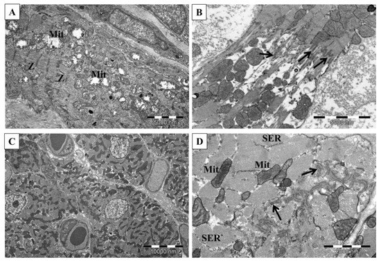 Ultrastructure of the cardiac muscle in rats subjected to EAM ((A,B)—EAM S3; (C,D)—EAM S30). Swollen mitochondria and substantial loss of myofilaments (A), myofilaments connected with the intercalated disc show disarrangement (B), normal heart (C), the well-organized structure of intercalated disc (D). Mit—mitochondria, Z—Z lines, arrows—intercalated disc, SER—sarcoplasmic reticulum. TEM.