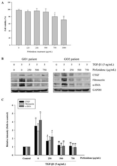 Inhibition of TGF-β1-enhanced fibrotic protein expression by pirfenidone in the primary cultures of human GO orbital fibroblasts. (A) After treatment of the GO orbital fibroblasts with various concentrations of pirfenidone (125, 250, 500, 750, and 1000 μg/mL, respectively) for 24 h, the cell viability was analyzed by a Trypan blue exclusion assay. (B) The GO orbital fibroblasts were pretreated with pirfenidone (250, 500 and 750 μg/mL, respectively) for one hour, followed by TGF-β1 (5 ng/mL) treatment for another 24 h. The protein expression levels of CTGF, fibronectin, and α-SMA were analyzed by Western blots. (C) The relative intensities of CTGF, fibronectin, and α-SMA expression normalized to each GAPDH were demonstrated. The relative intensities of the control without TGF-β1 treatment were defined as 1.0 and the other relative intensity (folds) is presented accordingly. The representative histogram is displayed based on the mean values of protein expression levels. Data are presented as means ± SD of the results from three independent experiments. * p < 0.05 and ** p < 0.01 vs. control without TGF-β1 treatment; # p < 0.05 and ## p < 0.01 vs. TGF-β1 treatment without pirfenidone.