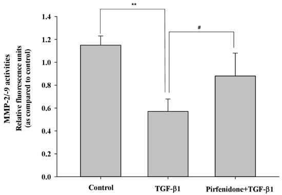 Recovery of the TGF-β1-inhibited MMP activities by pirfenidone in the primary cultures of human GO orbital fibroblasts. After pretreatment of the GO orbital fibroblasts with pirfenidone (500 μg/mL) for one hour, followed by the addition of TGF-β1 (5 ng/mL) for another 24 h, the enzyme activities of MMP-2/-9 from the cultured medium were determined. The representative histogram is displayed based on the mean values of relative fluorescence units. Data are presented as means ± SD of the results from three independent experiments. ** p < 0.01 vs. control without TGF-β1 treatment; # p < 0.05 vs. TGF-β1 treatment without pirfenidone.