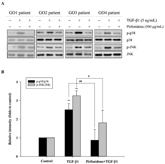 Abolishment of TGF-β1-induced p38 and JNK phosphorylation by pirfenidone in the primary cultures of human GO orbital fibroblasts. (A) After pretreatment of the GO orbital fibroblasts with pirfenidone (500 μg/mL) for one hour, followed by the addition of TGF-β1 (5 ng/mL) for another 24 h, p38 and JNK phosphorylation was determined by Western blots. (B) The expression ratios of p-p38 to p38 and p-JNK to JNK from the control without TGF-β1 treatment were defined as 1.0, and the other relative intensity (folds) is presented accordingly. By three independent Western blot experiments, data were averaged together from the same patient strain (GO1–GO4, n = 4). The representative histogram is displayed based on the mean values of protein expression levels. Data are presented as means ± SD of the results from three independent experiments. ** p < 0.01 vs. control without TGF-β1 treatment; # p < 0.05; ## p < 0.01 vs. TGF-β1 treatment without pirfenidone.