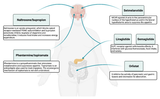 Except for orlistat, liraglutide, and the recently FDA-approved semaglutide the other approved drugs influence only central nervous system pathways that either reduce appetite or enhance satiety (Figure 3).