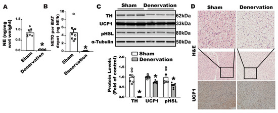 Surgical SNS denervation in iBAT reduces iBAT NETO and UCP1 levels in mice housed at room temperature. (A) NE content in iBAT of denervated and sham-operated mice. (B) NETO in iBAT of denervated and sham-operated mice. (C) Immunoblots of TH, phospho-HSL (pHSL) and UCP1 proteins in iBAT of denervated and sham-operated mice. (D) H&E staining and immunohistochemical staining of UCP1 in iBAT of denervated and sham-operated mice. Twelve-week-old C57BL/6J male mice were subjected to a surgical or sham bilateral SNS denervation in iBAT. All data are expressed as mean ± SEM; n = 6–8; * p < 0.05 vs. sham.