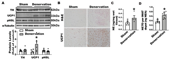Surgical SNS denervation in iBAT increases NETO and beiging in iWAT of mice housed at room temperature. (A) Immunoblots of TH and UCP1 protein in iWAT of denervated and sham-operated mice. (B) H&E images and immunohistochemical staining of UCP1 in iWAT of denervated and sham-operated mice. (C) NE content in iWAT of denervated and sham-operated mice. (D) NETO in iWAT of denervated and sham-operated mice. Twelve-week-old C57BL/6J male mice were subjected to a surgical or sham bilateral SNS denervation in iBAT. All data are expressed as mean ± SEM; n = 4–8; * p < 0.05 vs. sham.