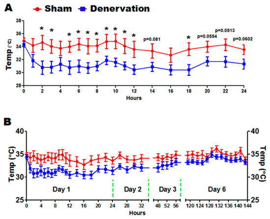 Body temperature of mice with iBAT surgical SNS denervation or sham operation during a seven-day cold exposure. (A) Body temperature in mice during the first 24 h of cold challenge. (B) Body temperature in mice during the seven-day cold challenge. Twelve-week-old C57BL/6J mice were subjected to a surgical or sham bilateral SNS denervation in iBAT and were then challenged with a seven-day cold exposure at 5 °C. All data are expressed as mean ± SEM; n = 7–8; * p < 0.05 vs. sham.