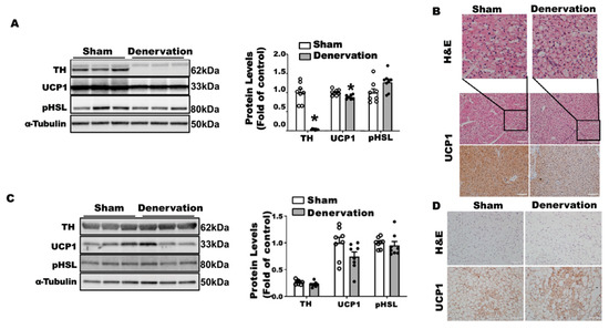 Surgical iBAT SNS denervation reduces TH and UCP1 protein levels in iBAT while slightly increasing beiging in iWAT of mice challenged with a chronic seven-day cold exposure. (A) Immunoblots of TH, UCP1 and pHSL protein in iBAT. (B) H&E images and immunohistochemical staining of UCP1 in iBAT. (C) Immunoblots of TH, UCP1 and pHSL protein in iWAT. (D) H&E images and immunohistochemical staining of UCP1 in iWAT. Twelve-week-old C57BL/6J male mice were subjected to a surgical or sham bilateral SNS denervation in iBAT and were then challenged with a seven-day cold exposure at 5 °C. All data are expressed as mean ± SEM; n = 7–8; * p < 0.05 vs. sham.