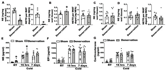 Assessment of catecholamine and glucocorticoids levels in iBAT, iWAT and blood of denervated and sham-operated mice during cold exposure. (A) NE content and NETO in iBAT of denervated and sham-operated mice challenged with a 16-h cold exposure. (B) NE content and NETO in iWAT of denervated and sham-operated mice challenged with a 16-h cold exposure. (C) NE content in iBAT of denervated and sham-operated mice challenged with a seven-day cold exposure. (D) NE content and NETO in iWAT of denervated and sham-operated mice challenged with a seven-day cold exposure. (E) Circulating NE levels in denervated and sham-operated mice during the seven-day cold challenge. (F) Circulating epinephrine levels in denervated and sham-operated mice during the seven-day cold challenge. (G) Circulating corticosterone levels in denervated and sham-operated mice during the seven-day cold challenge. All data are expressed as mean ± SEM; n = 7–10; * p < 0.05 vs. sham.