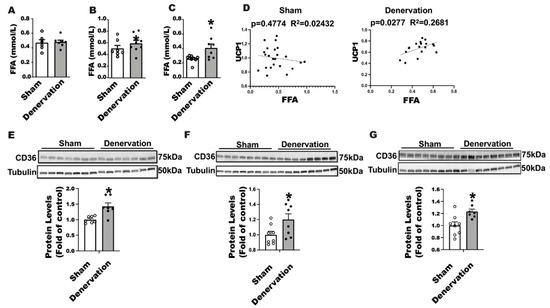 Fatty acids promote brown fat thermogenesis by serving as a fuel and a UCP1 activator [23,25]. We thus measured circulating free fatty acid levels in denervated and sham-operated mice along the course of 7-day cold exposure. There was no difference in circulating fatty acid levels between denervated mice and sham controls either housed at room temperature or challenged with an overnight cold (Figure 7A,B); however, the circulating fatty acid level was significantly increased in denervated mice after a seven-day cold exposure (Figure 7C). Interestingly, we discovered a strong positive correlation between circulating FFA levels and UCP1 protein contents in iBAT of denervated mice (Figure 7D right panel) but not sham mice (Figure 7D left panel), suggesting an important role for FFA in maintaining iBAT UCP1 protein in the absence of SNS innervation. FFA influx into brown fat relies on the fatty acid transport protein CD36. Immunoblotting analysis revealed an up-regulation of CD36 protein levels in iBAT of denervated mice compared to the sham controls housed at room temperature (Figure 7E), challenged with an overnight (Figure 7F) or seven-day cold (Figure 7G), suggesting an active transport of fatty acid into brown fat in the absence of SNS innervation.