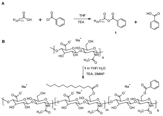 (A) The activation of dodecanoic acid mediated by benzoyl chloride. (B) The esterification of medium molecular weight HA carried out in water/THF.