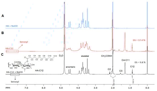 1H NMR spectrum of (A) Native HA (300 kDa) and esterified HA0-C12 measured in (B) D2O and (C) NaOD.