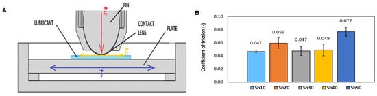 (A) Pin-on-plate configuration used in this work (B) The average friction coefficient of different silicone ball-hardness at normal force 1 N.