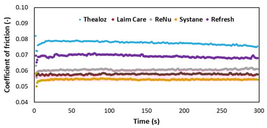 Thealoz duo® (Mw~220 kDa) shows a high CoF (0.077 ± 0.001). The last-mentioned formulation is usually recommended for patients with moderate to severe dry eye syndrome [,]. Refresh®, a low viscosity formulation, has a high CoF (0.069 ± 0.008). This agrees with a previously reported work, Refresh contacts drops proved to have less effect on the frictional properties of the lotrafilcon B lenses, showing a smaller decrease in friction than Systane® []. ReNu® (0.061 ± 0.005) showed a high CoF, which could be related to blurring effect in patients [].