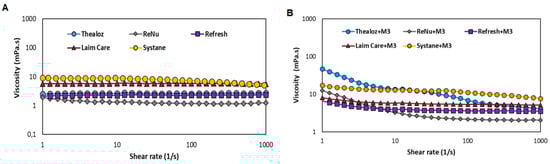 (A) Viscosity of eye drops determined as a function of shear rates (B) Mucoadhesive properties for eye drops with mucin III evaluated at shear rates 1–1000 s−1.