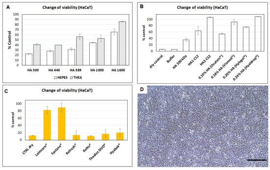 (A) The hydration-protection effect against desiccation after pre-treatment for HA (in HEPES or trehalose buffers) 0.3 wt.%. Results are mean ± SD, n = 3. (B) The hydration-protection effect against desiccation after pre-treatment for HA, HA2-C12 and OTC products. (C)The hydration-protection against desiccation after pre-treatment with selected OTC products. The results are an average (mean value ± SD, n = 6) Significant differences (p < 0.05) were compared to the control “dry cells” (D) Optical microscopic imagen of cell protection obtained for HA2-C12 (scale bar = 300 µm).