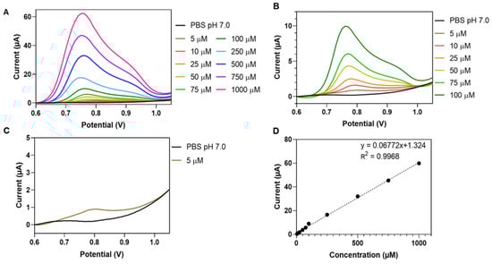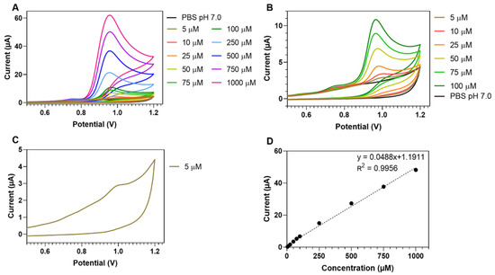 When the urine of a donor contains GlcNAcase because of renal damage and consequent leakage into the tubular lumen, addition of the sample to the electrolyte will cause enhanced release of 4NP, compared to the urine of a healthy person. The three-electrode arrangement transforms enzymic generation of free 4NP into a quantifiable electrical signal that can be calibrated to allow calculation of the GlcNAcase concentration in the urine sample. The responsiveness of BDD disk electrodes to the redox-active signaling molecule in the assay was tested by cyclic and pulse voltammetry in PBS, pH 7.0 with increasing concentrations of 4NP. Figure 1 and Figure 2 are cyclic (CV) and differential pulse (DPV) voltammograms that were obtained with the defined three-electrode set operating in solutions of 0–1000 µM 4NP in PBS. The CVs contained tiny current elevations at the base of the main peaks from the anodic oxidation of 4-NP. Zooms of the “foot” signals for the traces in Figure 1A,B (not shown) showed that they were also present with buffer alone, at the same potential and with the same magnitude for all 4-NP concentrations. Obviously, this tiny, reproducible trace feature is unrelated to the target analyte, 4-NP, but originates either from a trace contaminant in the PBS buffer or, more likely, it is a characteristic of the polished BDD disk working electrode, which undergoes an anodic redox reaction, such as surface carbon atom oxidation at that potential. However, since the artefacts are minor compared to the height of the analytically relevant 4-NP peak, their presence did not detract from the performance of our voltammetric GlcNAcase assay as the peaks of DPV recordings, which are the basis of our urinary assay, were free from the artefact. The slight DPV peak asymmetry and shoulder manifestation are likely a sign that oligomerization of radical intermediates of the primary 4-NP electrode interaction, and to a minor extent oligomer electrooxidation, took place at the anodically polarized BDD disk, but at slightly higher potentials than are needed for electron transfer from monomeric 4-NP. Extraction of anodic CV and DPV peak currents from triplicate repetitions of the voltammetric measurements and plotting the mean values against 4NP concentrations produced regression graphs with small data point standard deviations (<2%) and good linearity (R2 = 0.9959 (CV) and R2 = 0.9968 (DPV)). Carefully polished BDD disk electrodes achieved reliable voltammetric 4NP detection, with about 5 µM being the lowest concentration to produce analyzable anodic CV (Figure 1C) and DPV (Figure 2C) current peaks, which defined the practical limit of the two methodologies. Since the current peaks recorded in the differential pulse voltammetry mode were largely free of contributions from electrode capacitance charging currents, all further electrochemical 4NP tests used this practice. As a first step, positive 4NP redox label voltammetry was acquired by measurements of the target species in PBS solutions.