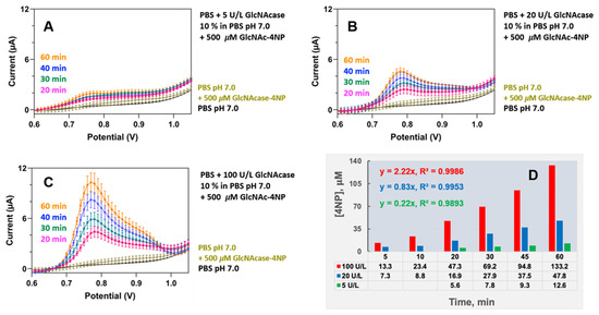Assessment of low (5 U/L, (A)), medium (20 U/L, (B)) and high (100 U/L, (C)) levels of the kidney status biomarker N-acetylglucosaminidase (GlcNAcase) in 0.1 M PBS, pH 7.0 model samples. A total of 300 µL of the simulated urine samples was added to 2700 µL of 0.1 M PBS, pH 7.0 containing 0.5 mM GlcNAc-4NP. 4NP differential pulse voltammograms (DPVs), recorded 20, 30, 45 and 60 min after initiation of the trial, visualized 4NP release through the concentration-dependent action of GlcNAcase on the labelled substrate with progressively increasing anodic peak currents. (D) Bar chart plot of anodic 4NP peak current magnitudes, ip, as functions of catalytic time. Insets in (D) are the slopes of regression lines through plots of the ip values as listed below the x-axes vs. corresponding reaction time. The average percentage standard deviation for the y-axes data point values of the triplicate trial, not specifically visualized here as error bars, was (11 ± 5)%. Parameters for DPV acquisition were as listed in Figure 2.