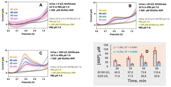 Urine from hospital patients with kidney problems, especially those with confirmed renal tubular damage and associated elevated urinary GlcNAcase levels, was not available in the laboratory phase of assay development during this study. Further measurements were therefore made using urine from a healthy, unmedicated donor. Samples were tested unmodified or with the addition of 20 and 100 U/L GlcNAcase to mimic a concerning or severely critical state of the kidneys. Figure 5 is a representative display of the three sets of DPVs that were acquired for unmodified and GlcNAcase-supplemented urine samples 20, 30, 45 and 60 min after their 10x dilution into 0.1 M PBS, pH 7.0. For simple urine addition to measuring buffer with 0.5 mM GlcNAc-4NP no well-defined elevation of the anodic WE current over the urine background was observed in the four timetabled DPV recordings (Figure 5A). Apparently, the urine lacked electrochemically detectable levels of metabolic interferents and as expected for a healthy person’s urine, its content of GlcNAcase as an enzymic biomarker of kidney problems was also insignificant. However, 10-fold diluted urine samples with 20 or 100 U/L GlcNAcase added to the electrolyte with 0.5 mM GlcNAc-4NP increased the 4NP concentration enough to produce progressively increasing anodic current peaks (Figure 5B,C). As with the entirely artificial PBS/GlcNAcase samples, ip/t bar chart plots and a comparison of the slopes of the linear regressions through the data points in plots of ip vs. corresponding reaction time showed a three- to four-fold difference between the voltammetry fingerprints of urine samples that simulated minor or major deterioration of kidney function (Figure 5D) while unmodified urine was voltammetrically silent.