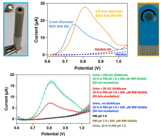 Commercial screen-printed electrodes with integrated 3.6-mm-diameter BDD disk sensors (Metrohm Siam Ltd., Bangkok, Thailand) were tested as alternative sensor strips for urinary GlcNAcase assessments. They were immersed in 5 mL of 0.1 M PBS pH 7.0 with the addition of urine or urine/GlcNAcase. 4NP voltammetry used a three-electrode configuration, but to allow better comparison with standard BDD electrode voltammetry, it was performed with the Pt-sheet and the Ag/AgCl (3 M KCl) used in standard trials serving as external equivalents, rather than the built-in counter- and reference-electrodes of the SPE platform.