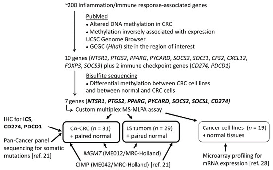 As these observations imply, inflammation has an important role in cancer; however, epigenetic regulation of inflammation-associated genes and its impact on UC- and LS-associated CRC tumorigenesis are not completely understood. Promoter methylation of inflammation-associated genes, such as CD274, may be a prognostic factor in sporadic CRC [20]. DNA methylation alterations of inflammation-associated genes could provide a specific mechanism for the widespread inflammatory/immunological alterations that accompany tumorigenesis, especially in association with the CpG island methylator phenotype (CIMP) or microsatellite instability (MSI). In this study, we aimed to evaluate the immunological landscape of CA-CRCs through ICS and altered methylation of inflammation-associated genes, using LS tumors for comparison (Figure 1).