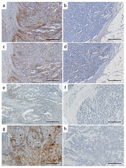 IHC staining of immunoproteins. Examples of (a) CD3 high, (b) CD3 low, (c) CD8 high, (d) CD8 low, (e) PDCD1 high, (f) PDCD1 low, (g) CD274 (IC) high and (h) CD274 (IC) low expressions. Black bars in the right bottom corners indicate the size of 500 µm.