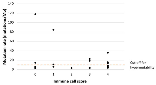 Of the 31 CA-CRCs, 27 were sequenced for somatic mutations as part of our previous study [21], which allowed us to compare mutational status and immunoprofiles. CA-CRC tumors broke down into three subgroups based on their status of MSI and hypermutability (the latter defined as over 10 nonsynonymous somatic mutations/Mb): group one comprised hypermutated MSI tumors (n = 1); group two, hypermutated MSS tumors (n = 9); and group three, non-hypermutated MSS tumors (n = 17). We plotted the number of somatic mutations against ICS, and all ICS groups, except number two, included two or three hypermutated tumors (Figure 3). Interestingly, two tumors (including the single one with MSI) had somatic mutation numbers around the “ultramutated” range (100 mutations/Mb) and both had low ICS values (0 and 1). The mutation rate (mutations/Mb) was not associated with the immunological subgroup defined by ICS and CD274 expression (p = 0.835). The ten hypermutant tumors were distributed among all four immunological subgroups, most commonly ICShigh/CD274pos (four tumors) and ICSlow/CD274neg (three tumors, including the single MSI tumor), followed by ICShigh/CD274neg (two tumors), and ICSlow/CD274pos (one tumor).