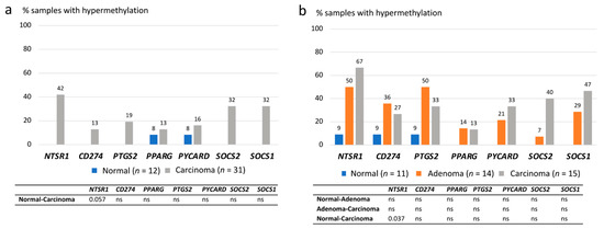 Methylation data were evaluated in two ways: first, by determining the frequencies of hypermethylation in tumor tissues relative to gene-specific thresholds derived from normal mucosa (Supplementary Table S2), and second, by using the degrees of methylation (based on methylation dosage ratios (Dm) obtained for each gene in each specimen) as continuous variables. In the former analysis, both CA-CRC and LS-associated colorectal samples showed hypermethylation of tumor samples compared with normal mucosae (Figure 4a,b). In CA-CRC, the hypermethylation frequencies of NTSR1, SOCS2, and SOCS1 (32–42%) clearly exceeded those of the paired normal tissues (0%); however, statistical significances were lost when the Bonferroni correction was applied (Figure 4a), and only NTSR1 remained borderline significant (p = 0.057). Among LS samples, NTSR1, SOCS2, and SOCS1 showed tentatively increased methylation frequencies in carcinomas compared to normal mucosae, but only NTSR1 remained significant after adjustment for multiple testing (p = 0.037) (Figure 4b). NTSR1 and PTGS2 hypermethylation were elevated already in adenomas and the latter one showed an even somewhat higher hypermethylation frequency in adenomas compared to carcinomas, 50% vs. 33% (Figure 4b).